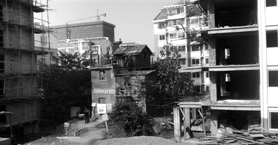 11月11日下午,张安房的三层小楼已被周边小区新楼包围,由于他拒不搬迁,边上两栋安置房无法完成施工。本报记者 周亦楣 摄