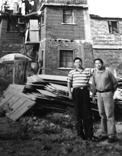2009年,张安房(左)和朋友在老屋前合影,他家已被停水断电一年。