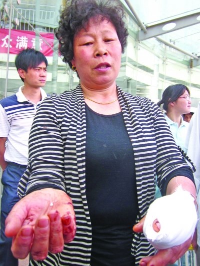 昨天上午,扬子晚报记者在江宁区上坊社区赵家村见到了受伤的曹女士,她的左手包扎着厚厚的一层纱布,可以看出伤势很严重。曹女士情绪激动地告诉记者,事情发生在前一天下午,因为自己在自家的院子里盖了间小房间,城管人员上门要拆,她没有开门,对方就要砸门。后来她害怕了,拿了把割韭菜的镰刀出来防身,结果没想到城管人员夺下她手里的镰刀,割伤了她的左手食指。由于当时血流不止,家人立即将她送往医院救治。经过医生诊断,曹女士的左手食指掌指关节指背处见一约4厘米斜行伤口,指血管、神经、肌腱、关节囊断裂伴皮肤撕脱伤,目前已经做了接缝手术。
